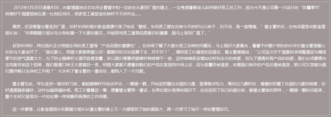 領(lǐng)導(dǎo)干部用人格魅力贏得信任和尊重,是以德服人的體現(xiàn),對(duì)于團(tuán)隊(duì)內(nèi)部正氣的培養(yǎng),向心力、凝聚力的增強(qiáng)具有重要意義,同時(shí)對(duì)于員工人品性格的完善、自我道德修養(yǎng)的提升也具有示范效應(yīng),有利于形成公平、公正的工作氛圍,傳遞正能量,打造幸福口味王。